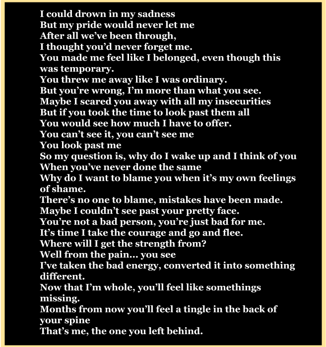Left Behind By Zach on February 21, 2020 • ( 0 ) By: Ebonie Fulwood Share this: Click to share on X (Opens in new window) X Click to share on Facebook (Opens in new window) Facebook Like Loading...‹ Let’s Talk About SexThe Futility of An Arguement ›Categories: PoetryTags: Culturally Biased, Left Behind, Poetry
